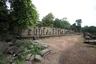 ตอบลบเมื่อผ่านประตูของหมู่ปราสาทออกไป ก็จะไปพบกับ "วิหาร" หรือ "หอพระ" ที่มีระเบียงคดรูปสี่เหลี่ยมล้อมรอบ ระเบียงคดในทิศนี้ ทำเป็นกำแพงมีหน้าต่าง หลังคามุงศิลาทราย ด้านบนประดับด้วยบราลีรูปพระพุทธเจ้าอมิตาภะแสดงอานุภาพในซุ้มเรือนแก้วเช่นเดียวกับกำแพงแก้ว "หอพระ วิหาร กุฏิ" ไม่ได้มีเฉพาะทางทิศทางตะวันตกเท่านั้นนะครับ ทางเหนือและใต้ก็มีมณฑลวิหารที่มีระเบียงคดแบบเดียวกันล้อมรอบ แต่ก็อยู่ในสภาพพังทลายเป็นส่วนใหญ่.