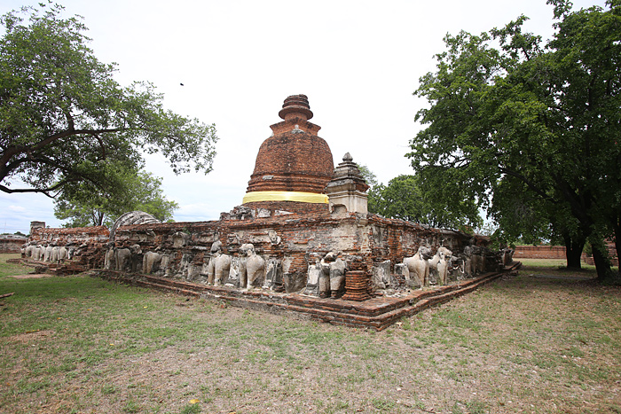A curious feature is the sixty meter long corridor connecting the east facade of the ubosot (ordination hall) with the east entrance. The importance of the temple in the Ayutthayan era is evident in the detail lavished on the principle chedi to the west of the ubosot. The chedi's base is surrounded with statues of the front quarters of elephants in a manner reminiscent of Sukhothai temples of the previous dynasty such as Wat Chang Lom in Si Satchanalai.