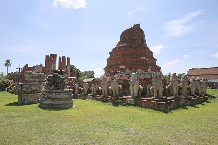 Wat Thammikarat (also called Wat Dhamikaraj) is a large temple located immediately to the east of the site of the Royal Palace of Ayutthaya. Its proximity and size testify to its importance in the Ayutthayan period, but it is not known precisely when the temple was founded. Local legends suggest that it may predate the founding of Ayutthaya itself in the 14th century; if so, its present buildings are almost certainly an early Ayutthayan-period reconstruction. Some evidence of antiquity includes a large bronze Buddhist head discovered here which was fashioned in a style "dating back to the second generation of U Thong art" (Ayutthaya: A World Heritage, p. 106). Another antique feature are the lion figures (singh) encircling the principal chedi that are quite similar to Khmer motifs seen at Angkor, a city which reached its zenith several hundred years before Ayutthaya's founding.